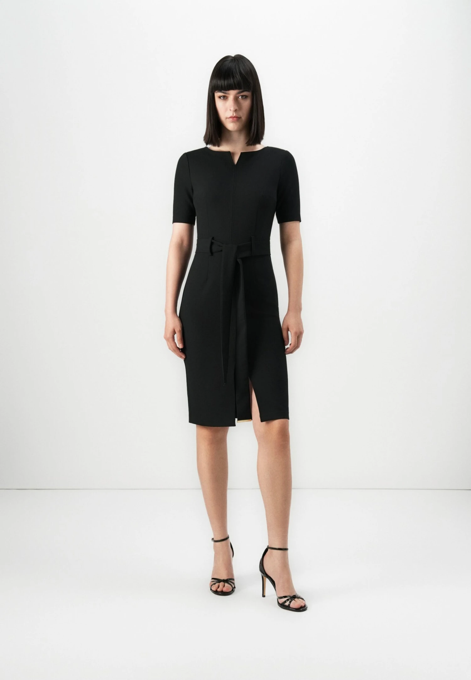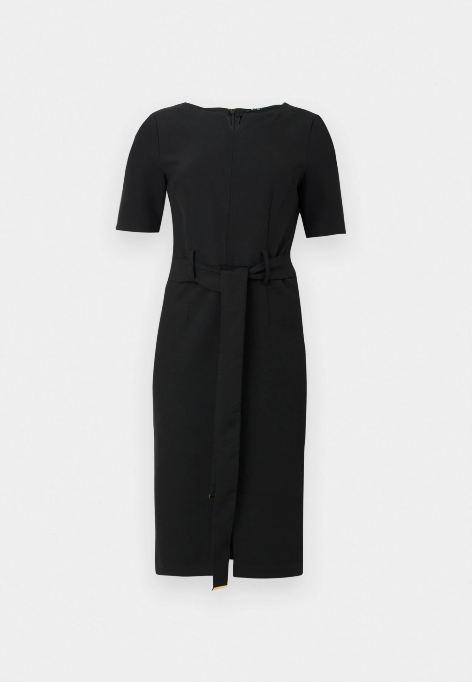 - Details: Bust darts, belt included, belt loops
